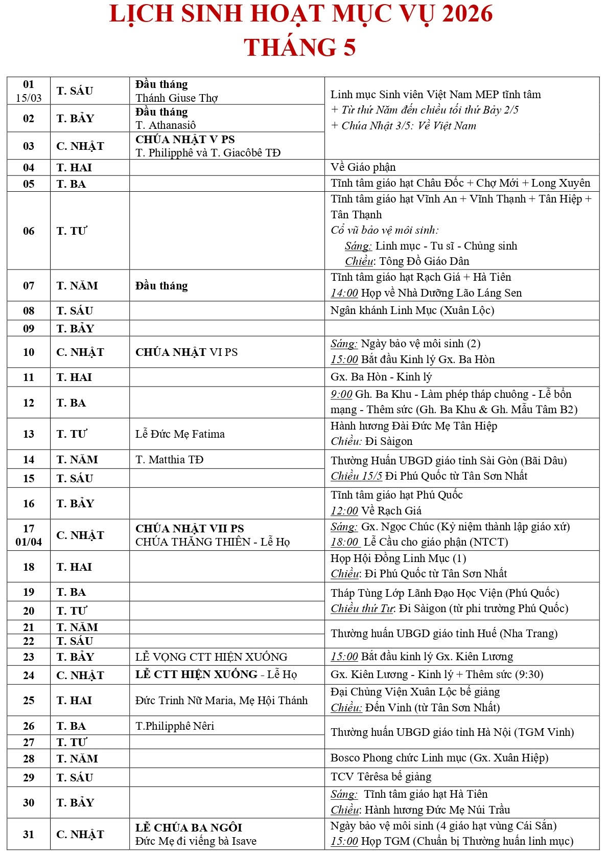 Lịch Mục vụ của Đức Giám mục tháng 04 & 05/2026