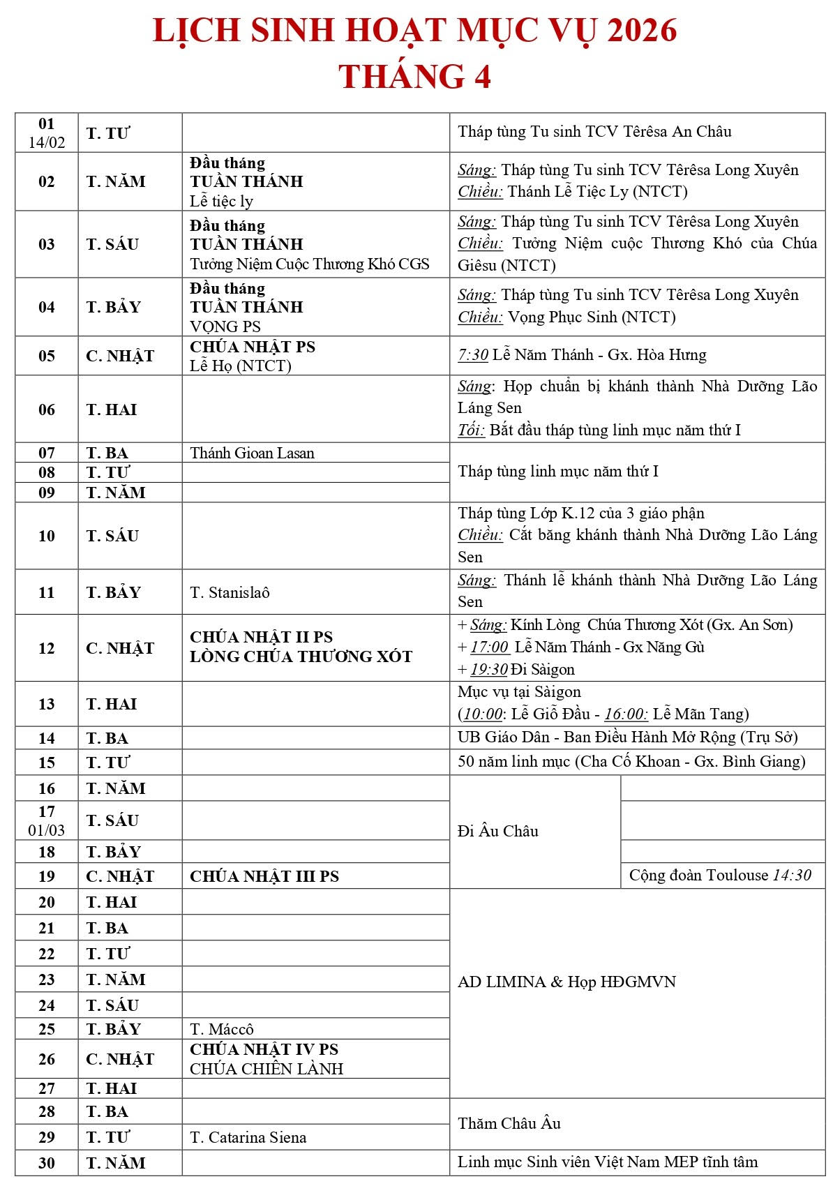 Lịch Mục vụ của Đức Giám mục tháng 04 & 05/2026